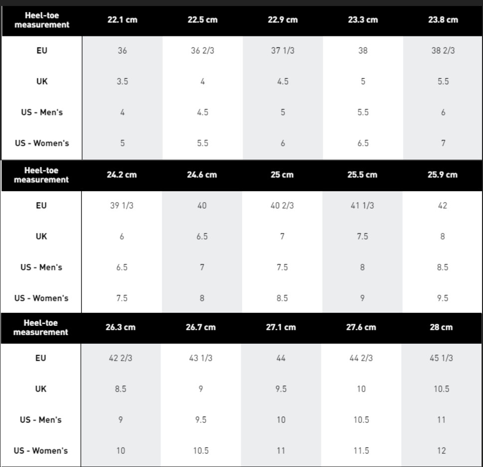 Giày Adidas, Nike, Puma đều có những quy ước size chung. Về cơ bản là cách tính giống nhau, chỉ là cách gọi khác nhau.